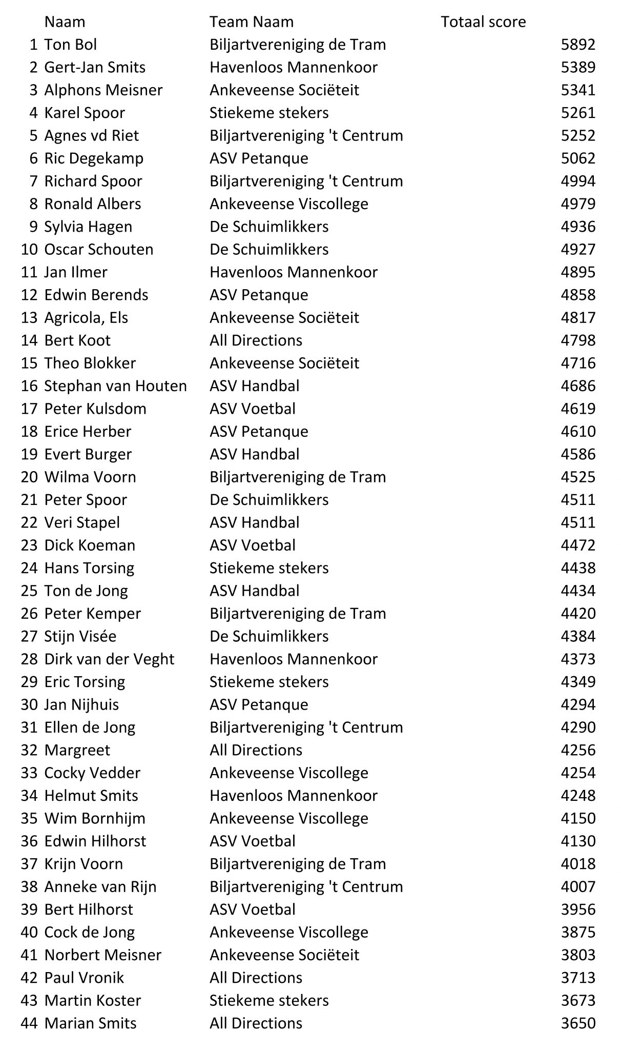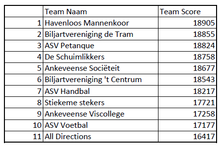 Na een lange avond kaarten bleek Havenloos Mannenkoor het sterkste team, met een indrukwekkende teamscore van 18.905 punten.